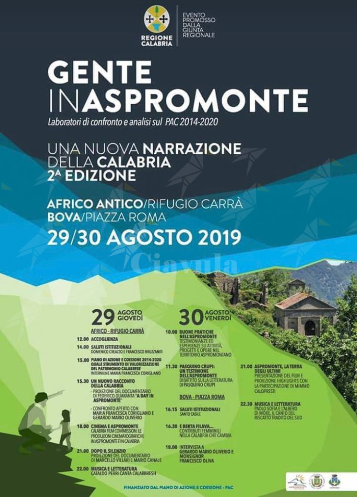 Appuntamento giorno 29 e 30 agosto 2019, presso il rifugio Carrà sito in Africo Antico, per l’evento promosso dalla Giunta Regionale “Gente in Aspromonte” nuova narrazione della Calabria.