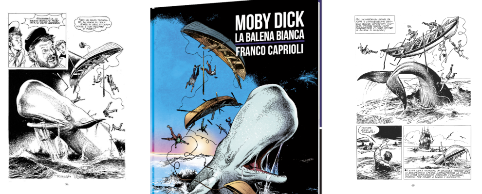 Il primo volume della collana a lui dedicata è «Moby Dick – La balena bianca» ispirato al capolavoro di Herman Melville, alla cui trasposizione Caprioli ha lavorato una volta come illustratore e due come autore di fumetti. Il volume pubblicato da Edizioni NPE raccoglie tutte le versioni: le illustrazioni decorrono l’introduzione e la postfazione di Gianni Brunoro; segue la prima storia a fumetti con didascalie, realizzata per il mercato inglese; infine il vero “core” è il fumetto pubblicato per la prima volta in Italia ne «I quaderni del fumetto» n. 20 (Fratelli Spada, 1975), per la sceneggiatura di Massimo Liorni. Un grande classico che vale sempre la pena rileggere, specie se illustrato da un maestro come Franco Caprioli. In libreria dal 24 febbraio.