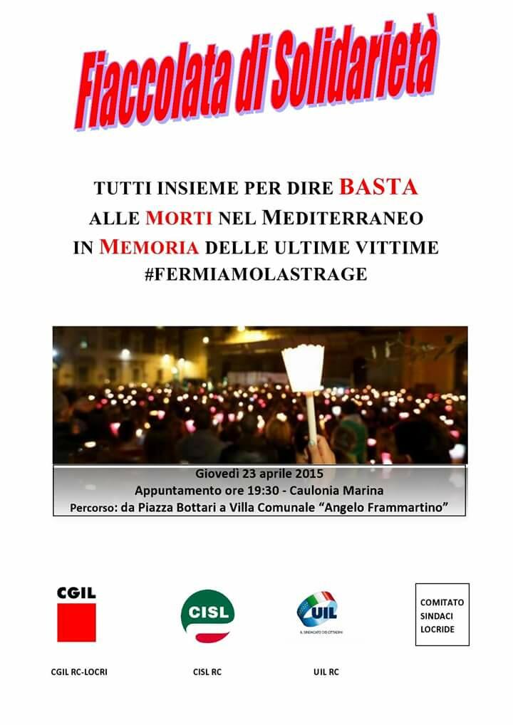 Dopo l’ ultima tragedia del 19 aprile 2015, in cui l’ ennesima “nave della speranza” è affondata nel canale di Sicilia, le segreterie di CGIL RC-Locri, di CISL RC, di UIL RC e il Comitato dei Sindaci della Locride hanno deciso di organizzare una “Fiaccolata” per commemorare le vittime del mare e per dire “basta alle morti nel Mediterraneo”.