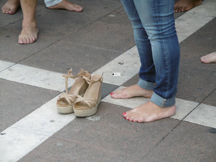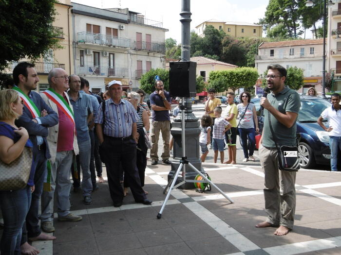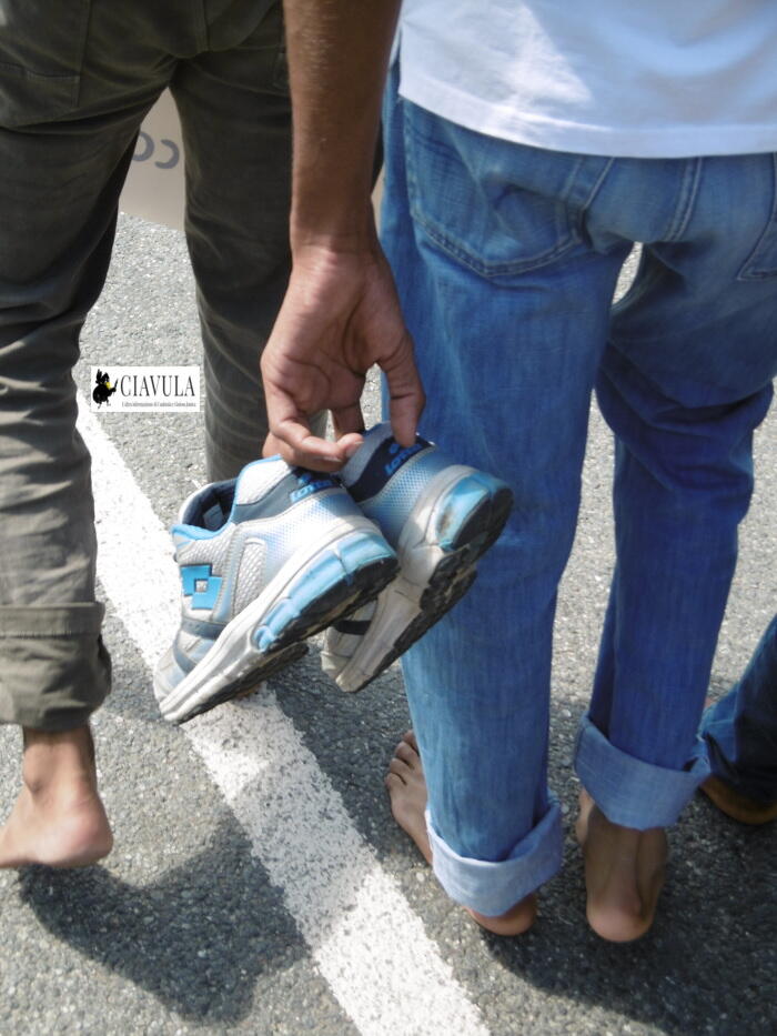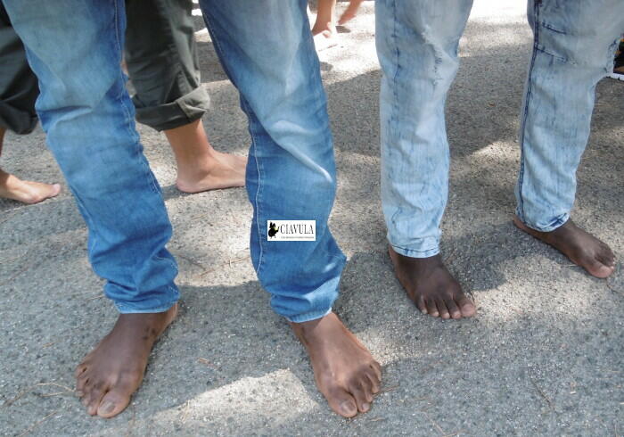 Non solo uomini e donne a piedi scalzi, ma anche i bambini. Diverse le associazioni, i comuni, le cariche presenti alla Marcia delle donne e degli uomini scalzi, organizzata dall’associazione ReCoSol di Gioiosa Jonica, aperta dallo striscione con su scritto “Nessun uomo è clandestino”. Quanti eravamo? Chi eravamo? Quanti non importa. Chi ha sentito il dovere morale di partecipare, ha partecipato. C’è chi ha voluto percorrere quelle strade che quotidianamente attraversiamo in auto, di corsa e talvolta a piedi, chi ha deciso di tenere per una ventina di minuti le proprie scarpe in mano, certo che una volta arrivato in piazza, si sarebbe trovata una fontana per sciacquarsi i piedi. E le scarpe erano lì, pronte per essere nuovamente indossate. La certezza, la sicurezza di poter riavere i piedi all’asciutto e al pulito: parole sconosciute per chi viene da lontano, per chi intraprende un viaggio che, a differenza di quello fatto simbolicamente stamattina, ha una meta immaginaria accompagnata dalla totale incertezza di raggiungerla. Il cammino intrapreso stamattina, insieme ai ragazzi immigrati del progetto Sprar di Gioiosa Jonica e non solo, è stato un cammino organizzato, calcolato, con orario di partenza e orario di arrivo ed una piccola accoglienza in Piazza Vittorio Veneto con qualcosa di fresco da bere. Cos’ha in comune con il viaggio intrapreso da un immigrato? Davvero poco. Un migrante non sa quando partirà, né quando arriverà. E se arriverà. Conoscevamo coloro che avrebbero partecipato alla nostra marcia: sono amici, colleghi, collaboratori coi quali si condividono gli stessi valori. Un migrante non sempre è a conoscenza di chi sarà suo compagno di viaggio. Del viaggio della speranza. Un migrante non può esser certo di trovare accoglienza una volta arrivato. Eppure noi questo simbolico viaggio insieme abbiamo deciso di intraprenderlo, lamentandoci, com’è nella nostra indole fare, di un asfalto a tratti caldo e di un po’ di polvere sotto ai piedi. Abbiamo utilizzato i piedi, gli stessi piedi che pochi giorni fa una giornalista ungherese ha ben pensato di usare per mettere lo sgambetto ad un padre, immigrato, in fuga col figlio in braccio. E per tirare dei calci ad altri.