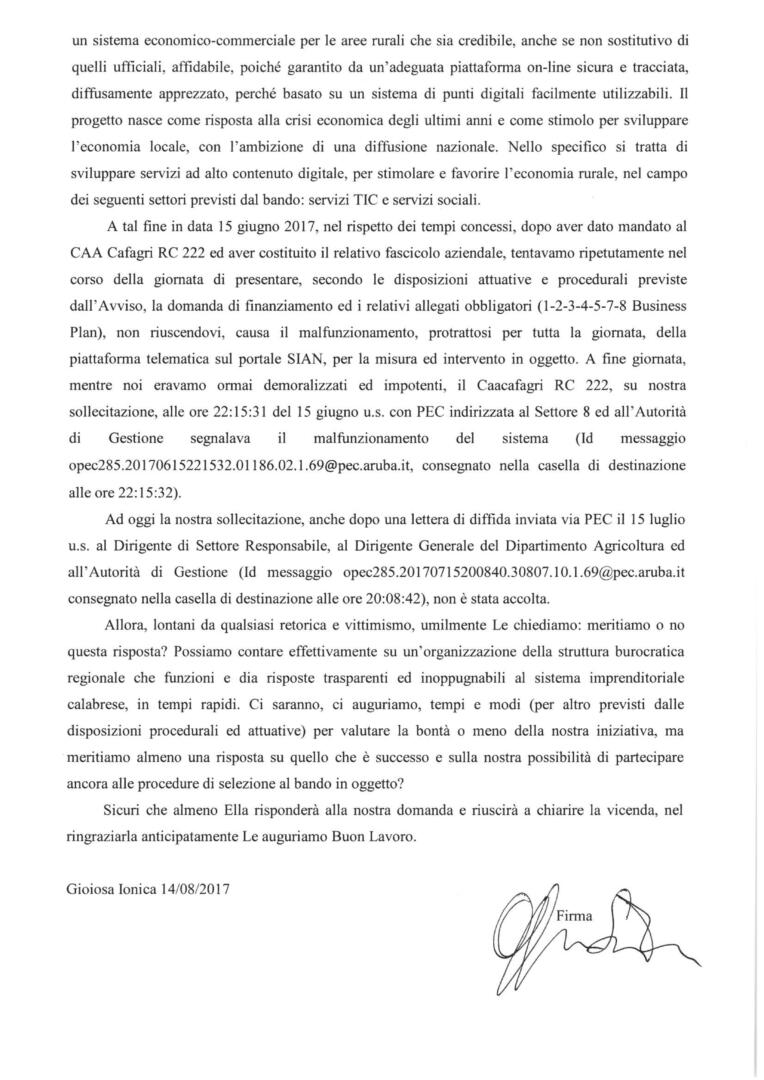 Nel giugno scorso, CLIRA SRLS ha provato senza riuscirvi a trasmettere in via telematica una richiesta di partecipazione ad apposito bando di finanziamento regionale. La responsabilità della mancata trasmissione è dipesa da ragioni strettamente tecniche, con il cattivo funzionamento della piattaforma telematica predisposta dalla Regione Calabria.