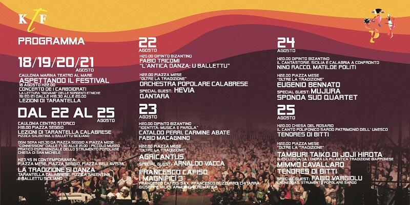 La XX edizione del Kaulonia Tarantella Festival affiancherà nuovamente le serate squisitamente musicali ai pomeriggi culturali offerti dalle lezioni di tarantella quest’anno in tre diverse versioni: calabrese (riggitana), salentina (pizzica) e siciliana (ballettu). La vera novità di quest’anno, tuttavia, è rappresentata dal fatto che ogni serata è affidata all’estro artistico di coloro che hanno fatto la storia del Festival ed ognuno di loro offrirà al pubblico del KTF quattro diverse interpretazioni della kermesse.