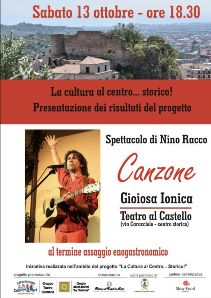 Alle ore 18.30, si cambia sede per un’altra ottima iniziativa culturale: presso il Teatro al Castello, ecco lo spettacolo CANZONE di Nino Racco, a conclusione del progetto “La cultura al centro storico” voluto e realizzato da Don Milani Onlus. Al termine dello spettacolo, sarà anche offerto un assaggio enograstronomico con prodotti locali.