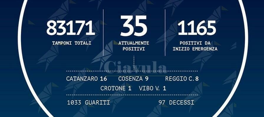 – Crotone: 1 in isolamento domiciliare; 112 guariti; 6 deceduti.