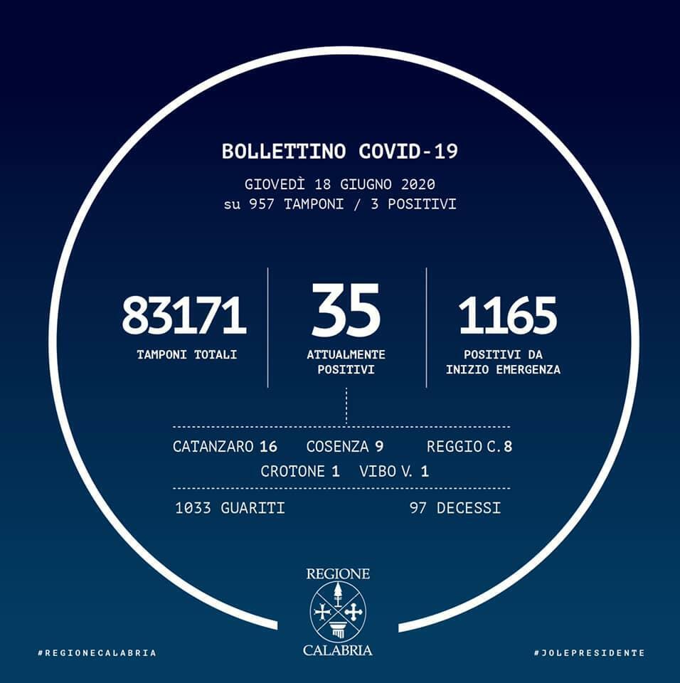In Calabria ad oggi sono stati effettuati 83.171 tamponi. Le persone risultate positive al Coronavirus sono 1.165 (+3 rispetto a ieri), quelle negative sono 82.006. Territorialmente, i casi positivi sono così distribuiti: