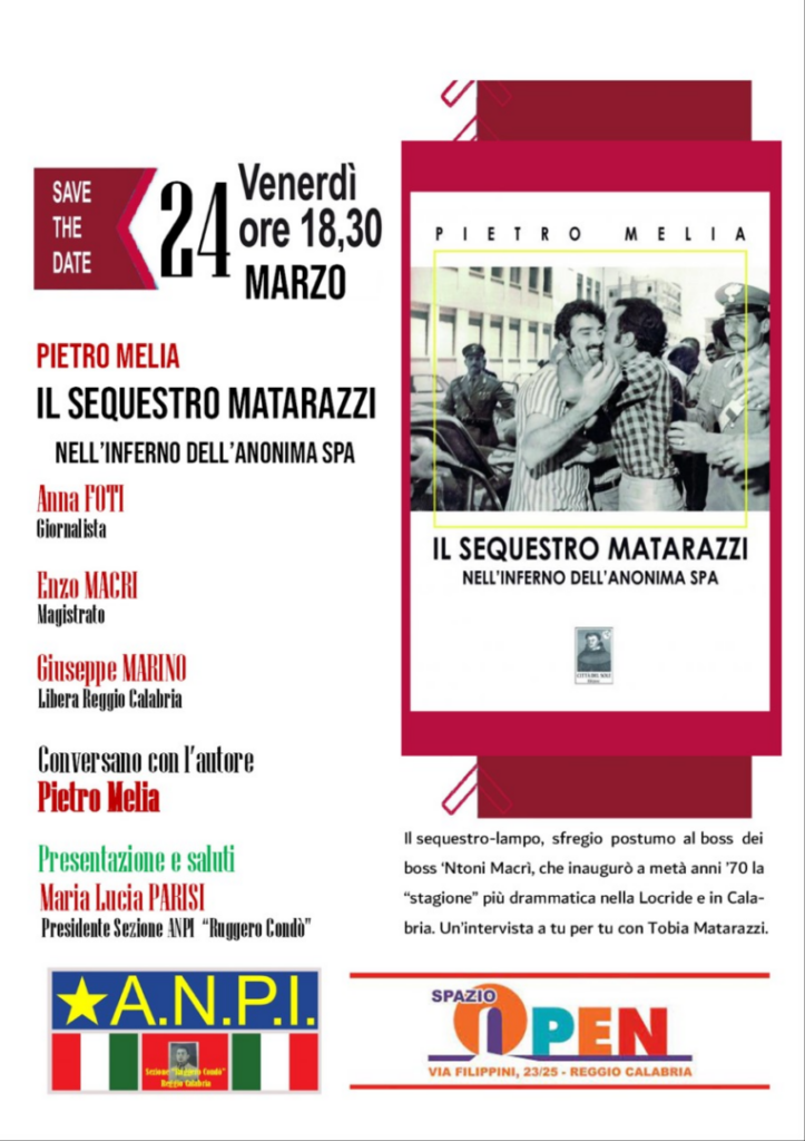 Sarà presentato, venerdì 24 marzo 2023, a Reggio Calabria nei locali di Spazio Open, a cura della Sezione ANPI “Ruggero Condò”, il libro di Pietro Melia “Il sequestro Matarazzi” edito da Città del Sole edizioni.