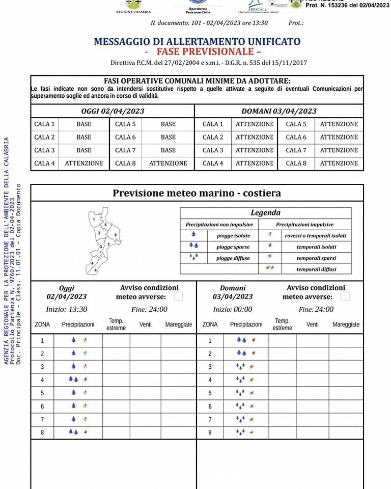 Allerta GIALLA sulla Calabria Tirreno Centro settentrionale (Cala 1 e 2).