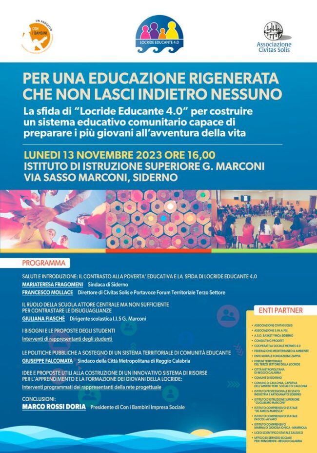 Si svolgerà lunedì prossimo, 13 novembre, presso l’istituto superiore Guglielmo Marconi di Siderno, un incontro programmatico del progetto “Locride educante 4.0”, iniziativa selezionata da Con i Bambini impresa sociale nell’ambito del Fondo per il contrasto della povertà educativa minorile. L’evento è finalizzato a co-costruire un sistema territoriale di comunità educante capace di contrastare la rilevante povertà educativa che si registra nel comprensorio della Locride in Calabria.