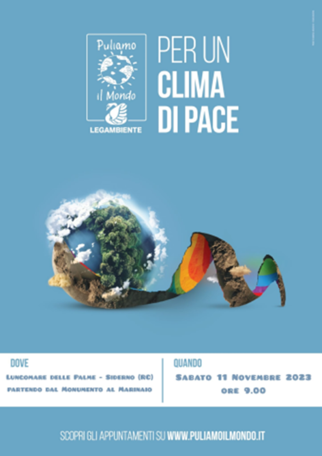 L’Amministrazione Comunale di Siderno aderisce all’edizione 2023 di “Puliamo il Mondo“, organizzando nella giornata di Sabato 11 Novembre, dalle ore 9.00 alle ore 12.00, un momento in cui si fa promotrice diretta di buone pratiche a favore dell’ambiente e invitando cittadini volontari a contribuire con il proprio operato a ripulire, valorizzare e conservare il proprio territorio.