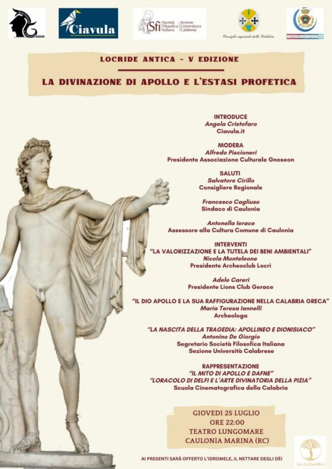 Ad impreziosire ulteriormente l’incontro, introdotto dalla redattrice di Ciavula.it Angela Cristofaro e moderato dal Presidente dell’Associazione Culturale Gnoseon Alfredo Piscioneri, ci saranno gli attori: Mario Alfonso Altavilla, Marcella Mesiti e Gaia Carlotta Ndoye che rappresenteranno “Il mito di Apollo e Dafne” e “L’oracolo di Delfi e l’arte divinatoria della Pizia”. A conclusione dell’appuntamento, al quale prenderano parte anche il Consigliere regionale Salvatore Cirillo, il Sindaco di Caulonia Francesco Cagliuso e l’Assessore alla cultura del Comune di Caulonia Antonella Ierace, verrà offerto come di consueto l’idromele – il nettare degli dèi.
