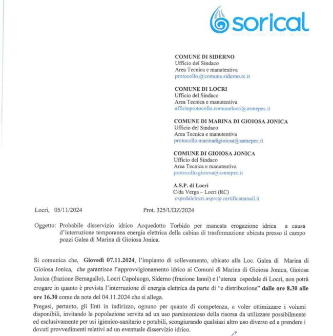 Sorical ha comunicato che giovedi 7 novembre, l’impianto di sollevamento di Galea a Marina di Gioiosa Jonica, che serve i comuni di: Marina di Gioiosa Jonica, Gioiosa Jonica (frazione Bernagallo), Locri, Siderno (frazione Lànnì) e l’ospedale di Locri, interromperà l’erogazione dell’acqua dalle 8:30 alle 16:30 per lavori sulla rete elettrica.