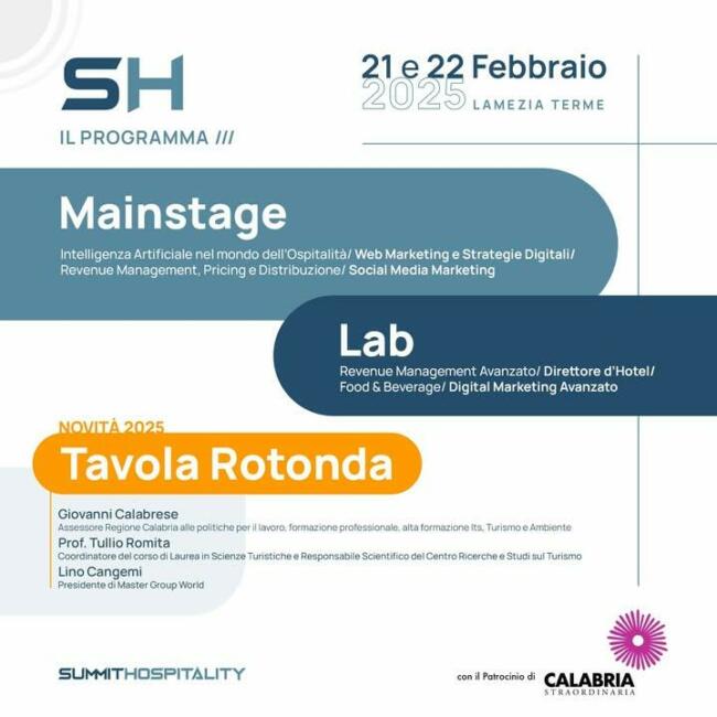 Bruno Strati è lieto di annunciare la terza edizione del corso di formazione leader nel Sud Italia, che si terrà il 21 e 22 febbraio 2025 presso il T Hotel di Lamezia Terme. Il Mainstage, disponibile anche in live streaming, si rivolge ai professionisti dell’ospitalità e del turismo, offrendo un programma ricco di contenuti formativi e opportunità di networking. I Lab, invece, potranno essere seguiti solo in presenza. Patrocinato da Calabria Straordinaria, il Summit si concentrerà su temi strategici per il settore, tra cui Intelligenza Artificiale nell’Ospitalità, Web Marketing, Revenue Management, Social Media Marketing e Food & Beverage. Una delle novità principali di questa edizione è il focus speciale dedicato al reparto Food & Beverage all’interno dei Lab che rappresenta un’opportunità unica per approfondire le strategie innovative applicate a questo ambito chiave del settore.