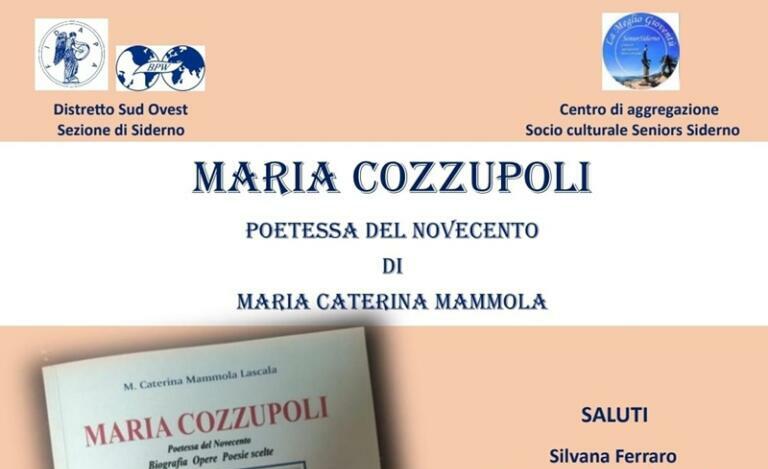 La sezione Fidapa di Siderno e il Centro di aggregazione socio culturale Seniors Siderno presentano il libro “MARIA COZZUPOLI Poetessa del Novecento” di Maria Caterina Mammola, con il patrocinio del Comune di Siderno, presso la sala consiliare venerdì 4 aprile p.v. alle ore 18. Dopo i saluti di Silvana Ferraro, Presidente Fidapa Siderno, di Cesira Sorace, Presidente del Centro di aggregazione socio culturale Seniors Siderno, e di Mariateresa Fragomeni, Sindaco della Città di Siderno, dialogherà con l’autrice Simona Masciaga, Professoressa e critico letterario.  “Maria Cozzupoli fu una delle prime, nel Sud magnogreco del secolo scorso, pur di umili origini e con risorse economiche modeste, a intraprendere il cammino universitario, orgogliosa della cultura umanistica che aveva riempito la sua vita.”