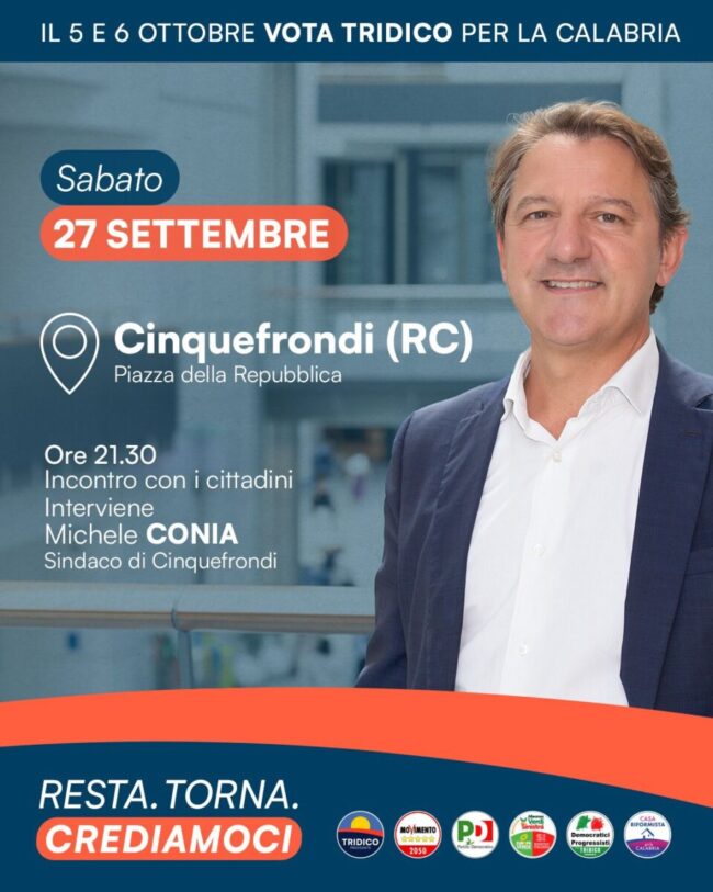 Durante l’evento sarà presentato Pasquale Tridico, candidato alla Presidenza della Regione Calabria, sostenuto da una coalizione progressista e civica che comprende, tra gli altri, il Movimento 5 Stelle, il Partito Democratico, e diverse liste territoriali impegnate per una Calabria giusta, solidale e moderna.