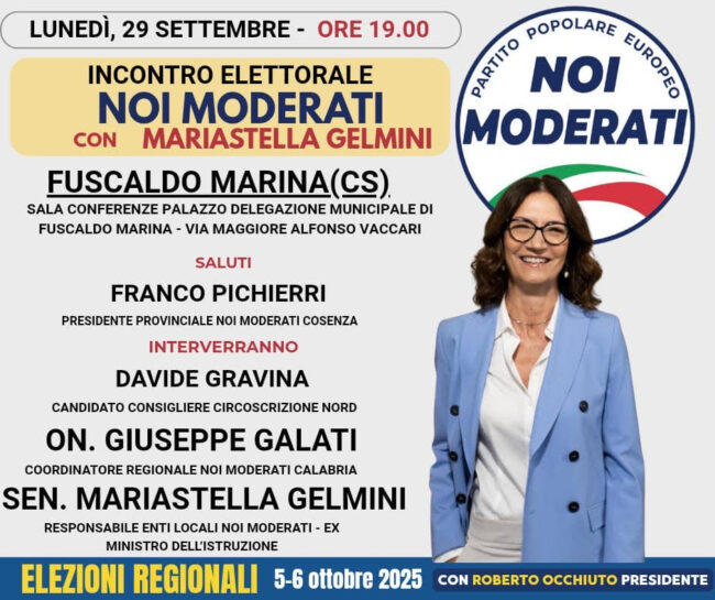 Lunedì 29 settembre, la senatrice Mariastella Gelmini, neo responsabile nazionale Enti Locali di Noi Moderati ed ex Ministro dell’Istruzione, sarà in Calabria per una serie di appuntamenti elettorali a sostegno della lista Noi Moderati e dei candidati impegnati nelle elezioni regionali del prossimo 5 e 6 ottobre 2025.