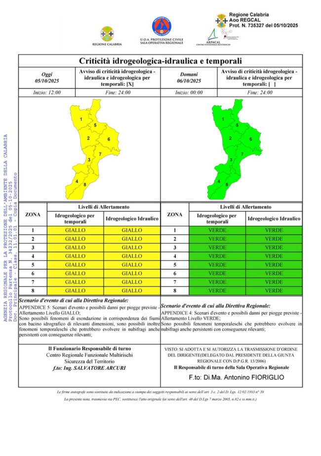 Meteo in peggioramento sulla Calabria, la Protezione Civile ha diramato per oggi, 5 ottobre 2025, un’allerta gialla su tutta la regione per piogge e temporali con possibili grandinate, forti raffiche di vento e mareggiate lungo le coste esposte.