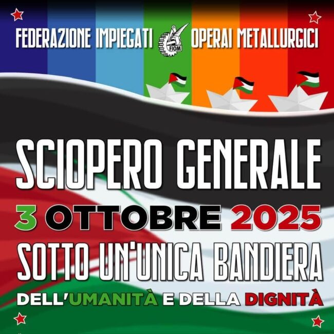 La Fiom partecipa allo sciopero generale indetto dalla Cgil per venerdì 3 ottobre e sarà in piazza in tutte le città per sostenere la Global Sumud Flottilla e per fermare il genocidio del popolo