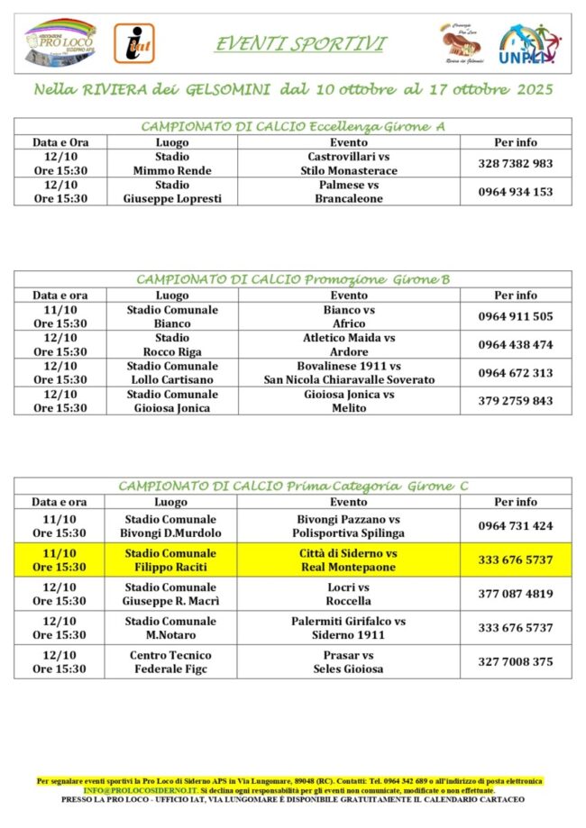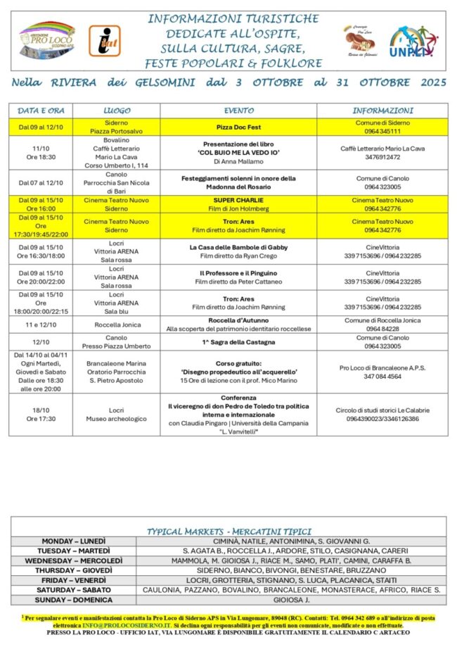Condividiamo di seguito l’elenco degli eventi culturali e sportivi della Locride che si terranno dal 10 al 18 ottobre 2025.