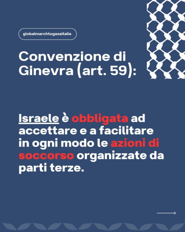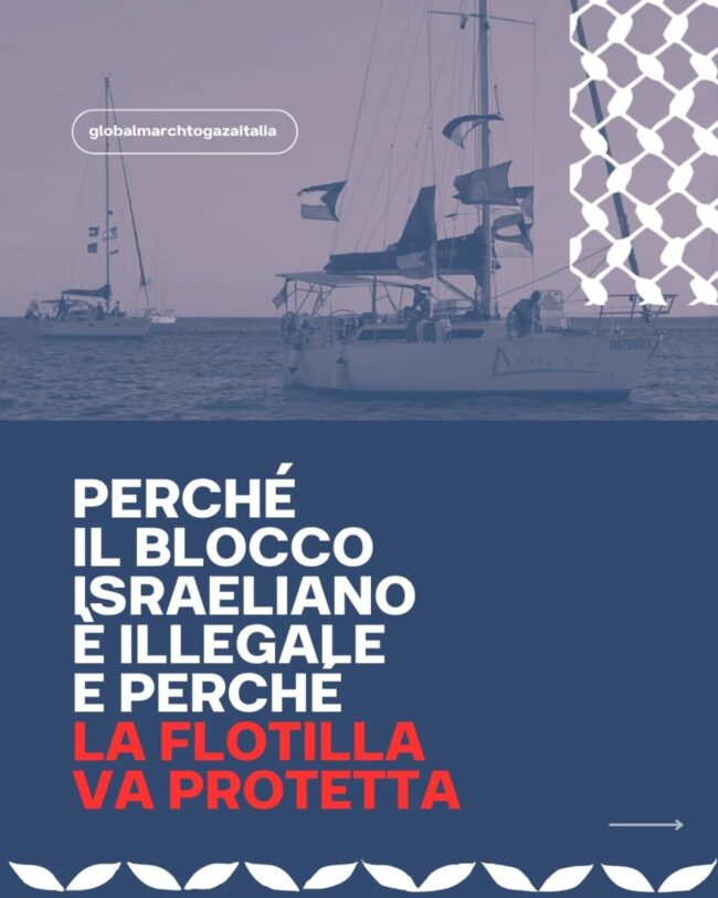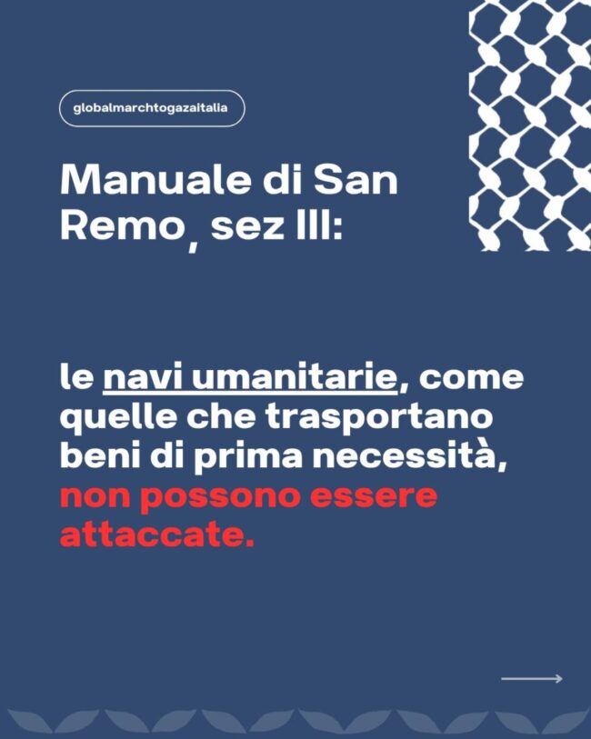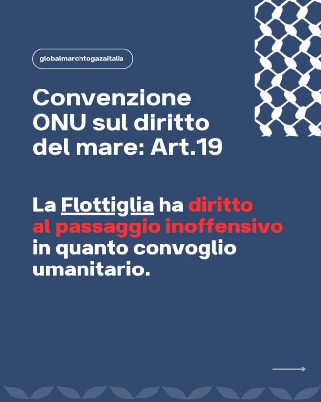Lo ripetiamo per chi ancora non vuol sentire: la Global Sumud Flotilla opera nella piena legalità del diritto internazionale. Chi agisce contro ogni Convenzione è Israele.
