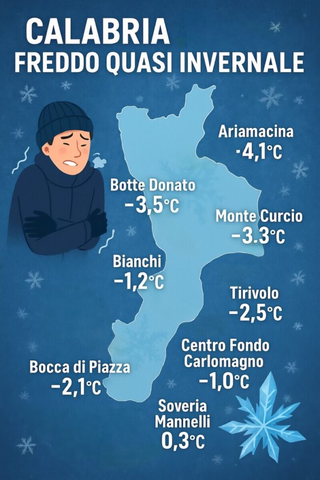 Meteo, in Calabria un brusco calo delle temperature. Nella notte temperature sotto lo zero in molte localitร