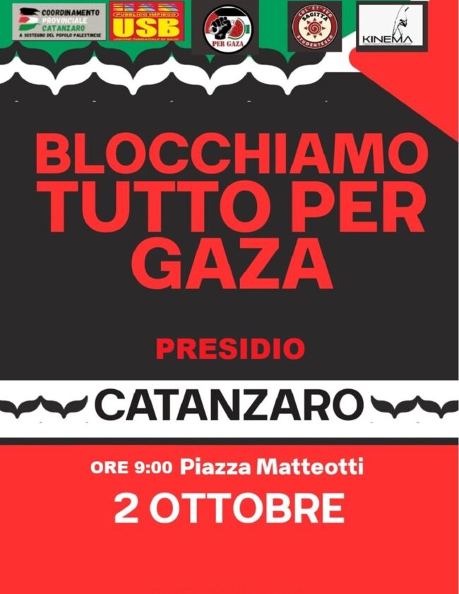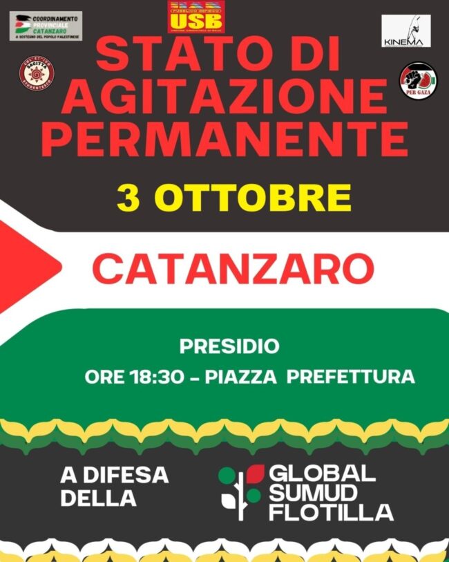 Il 2 e 3 saremo a Catanzaro, in piazza Matteotti, in stato di agitazione permanente per bloccare tutto nel caso in cui lo Stato sionista di Israele dovesse attaccare la Global Sumud Flotilla.