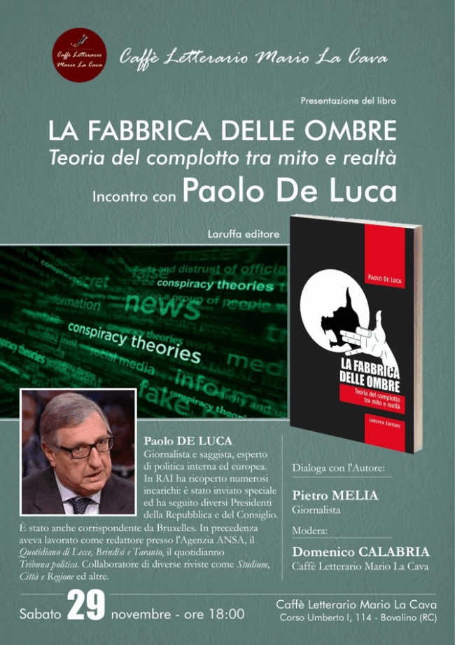A Bovalino la presentazione del libro “La fabbrica delle ombre. Teoria del complotto tra mito e realtà” di Paolo De Luca