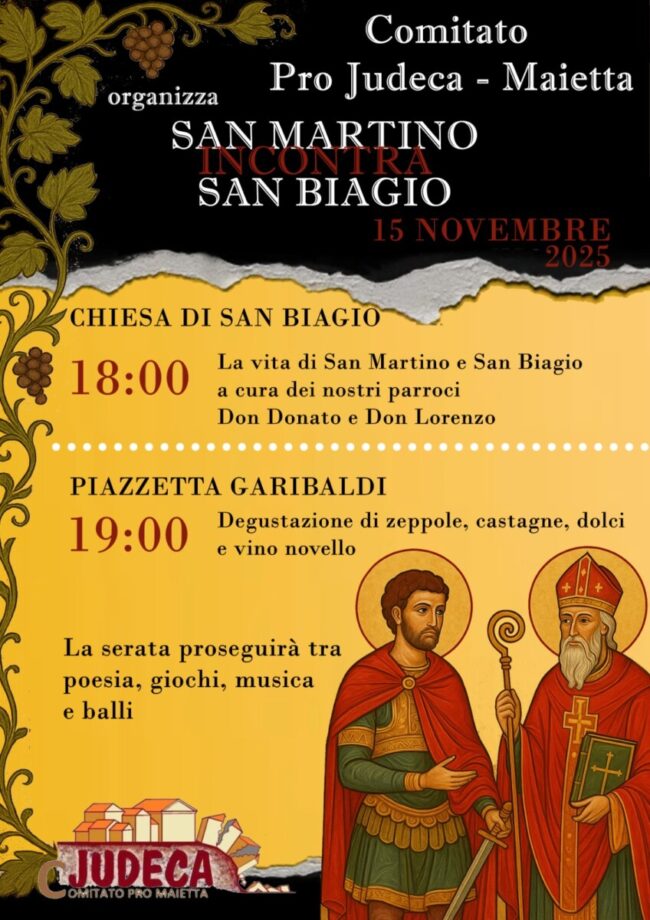 il Comitato Pro Judeca-Maietta è lieto di comunicare l’organizzazione della Festa “San Martino incontra San Biagio”, evento che si terrà a Caulonia Superiore, in data 15 Novembre dalle 18:00 alle 00:00.