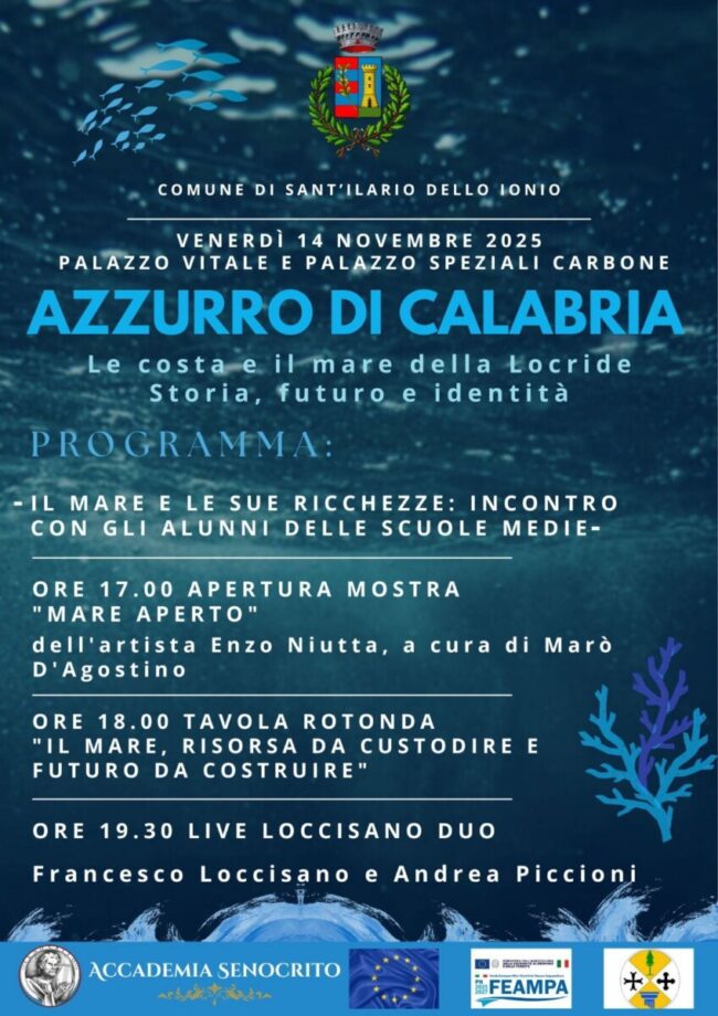 Approfondimenti, incontri con gli studenti, arte e musica, venerdì 14 novembre 2025, a Sant’Ilario dello Ionio, per “Azzurro di Calabria – Le coste e il mare della Locride – Storia, Futuro e Identità”, festival itinerante promosso dal comune di Portigliola, in partenariato con i comuni di Ardore, Bianco, Bovalino, Camini, Caulonia, Grotteria, Locri, Monasterace, Riace, Roccella Jonica, Sant’Ilario dello Ionio, Siderno, Stignano e Stilo, sostenuto dal Ministero dell’Agricoltura e della Regione Calabria.
