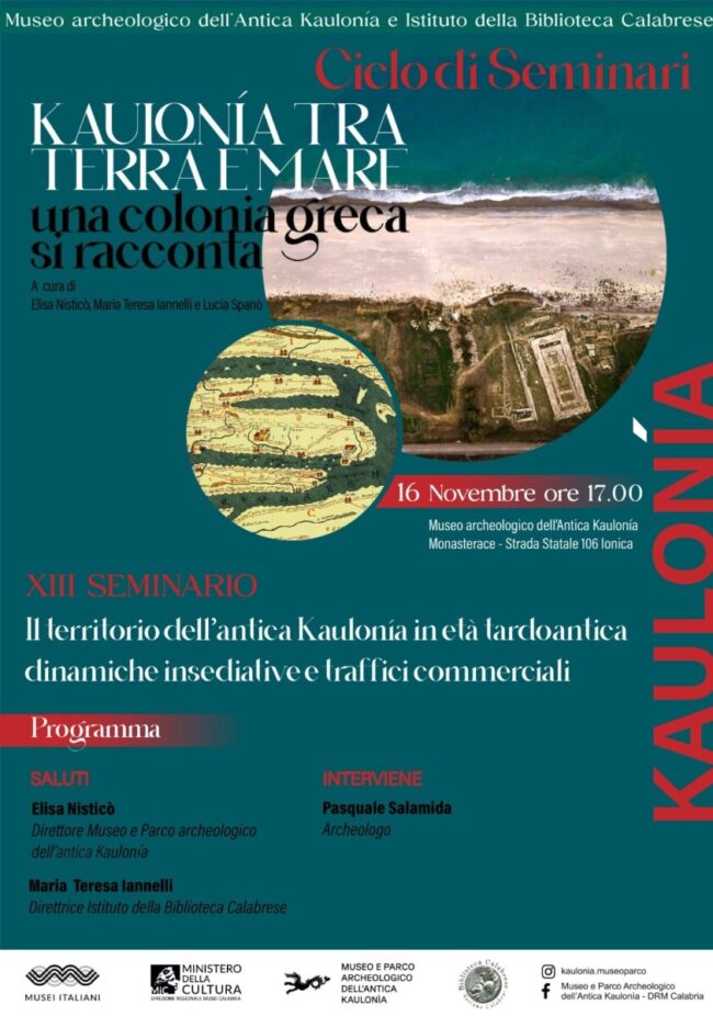 Domenica, 16 Novembre, il Museo Archeologico di Monasterace ospiterà il 13° seminario dal titolo “Il territorio dell’antica Kaulonia in età tardoantica. Dinamica insediativa e traffici commerciali”, a cura del dott. Pasquale Salamida.