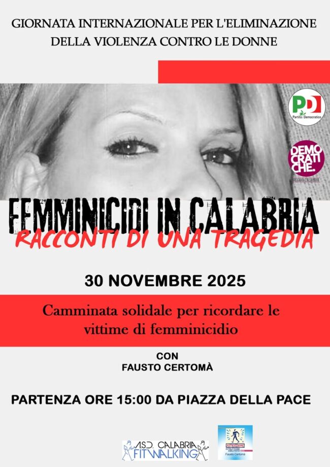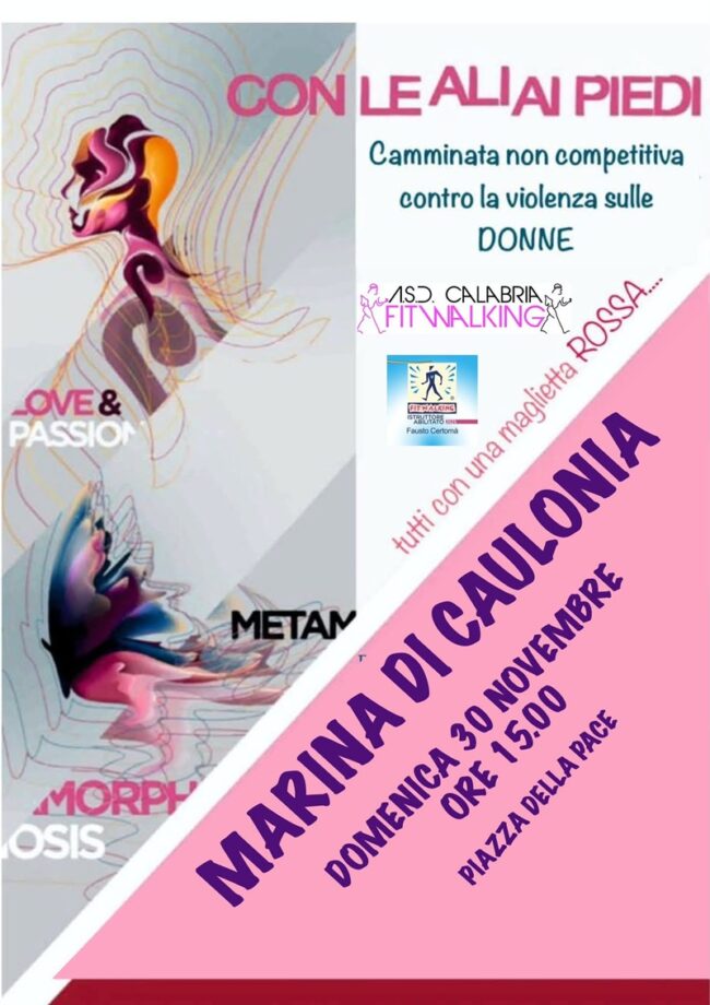 Il 30 novembre, a Caulonia Marina, si terrà una camminata solidale contro la violenza sulle donne. L’iniziativa, organizzata dal Circolo PD di Caulonia, Democratiche Calabria e da ASD Calabria Fitwalking, partirà alle 15:00 da Piazza della Pace. L’evento è aperto alla cittadinanza.