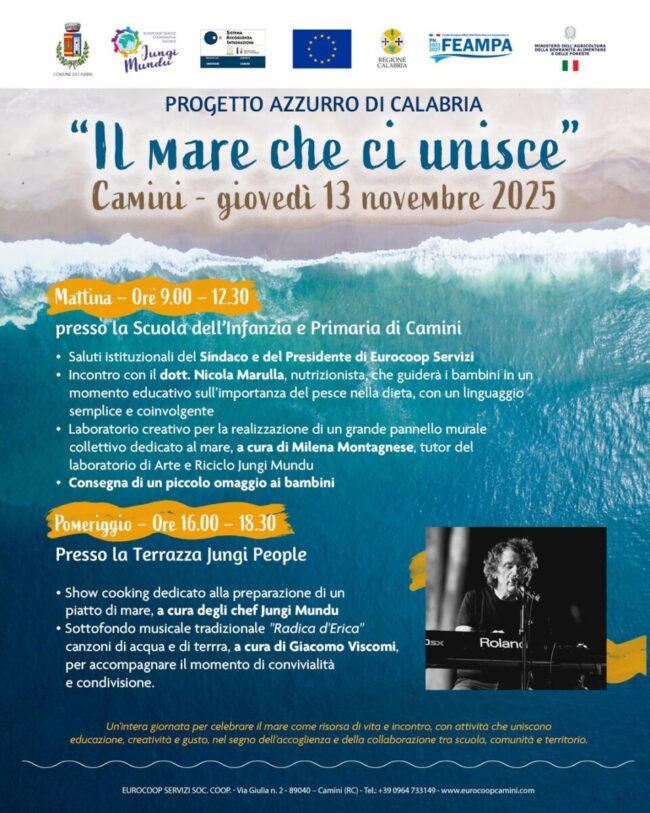 Il mare come ponte tra culture e risorsa di vita e strumento. È questo il filo conduttore dell’evento “Il mare che ci unisce”, in programma giovedì 13 novembre 2025, organizzato dal Comune di Camini e dalla Eurocoop “Jungi Mundu”, nell’ambito del progetto “Azzurro di Calabria – Le coste e il mare della Locride – Storia, Futuro e Identità”, festival itinerante promosso dal comune di Portigliola, in partenariato con i comuni di Ardore, Bianco, Bovalino, Camini, Caulonia, Grotteria, Locri, Monasterace, Riace, Roccella Jonica, Sant’Ilario dello Ionio, Siderno, Stignano e Stilo, sostenuto dal Ministero dell’Agricoltura e della Regione Calabria.