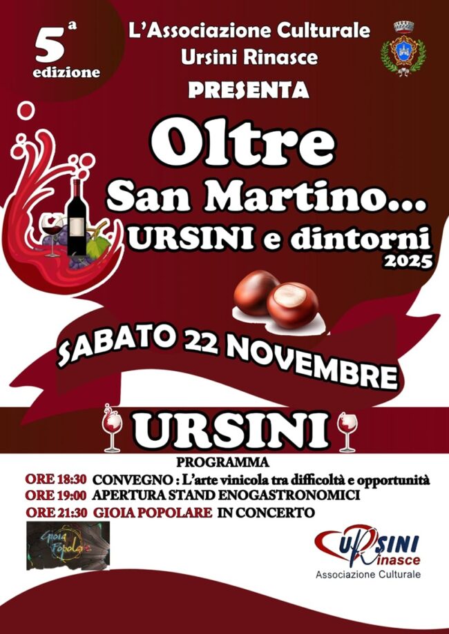 L’Associazione Culturale Ursini Rinasce presenta la quinta edizione di “Oltre San Martino… Ursini e dintorni 2025”, in programma sabato 22 novembre a Ursini di Caulonia. La giornata prevede un convegno dedicato all’arte vinicola, stand enogastronomici e, in serata, il concerto del gruppo Gioia Popolare.