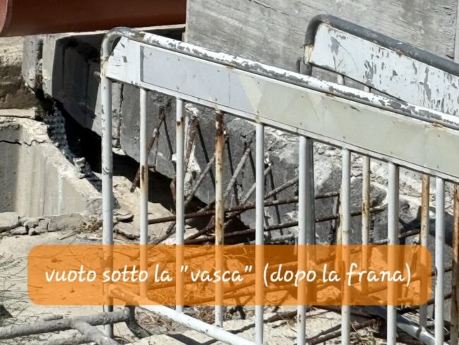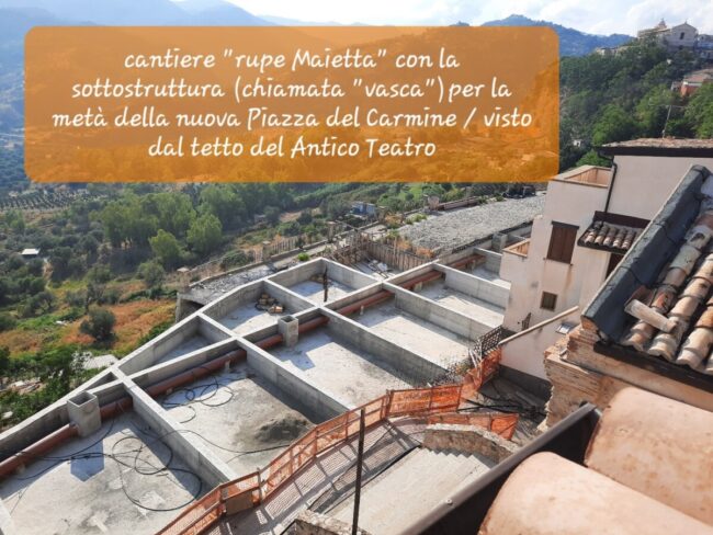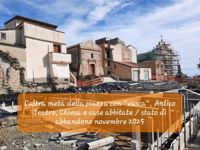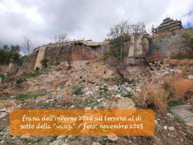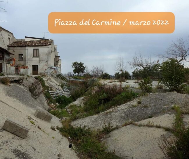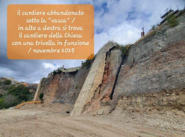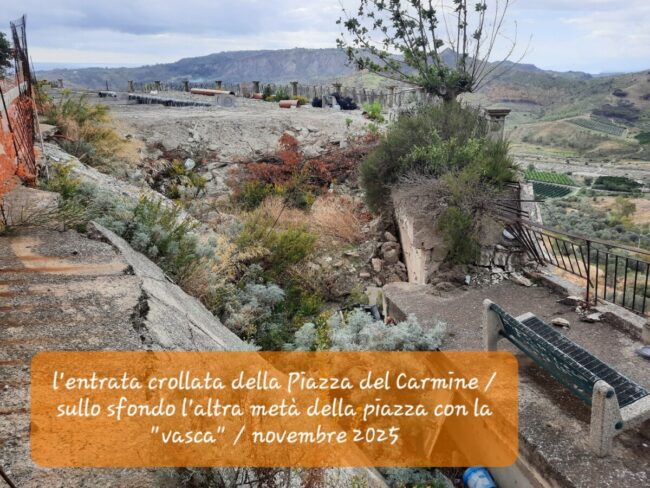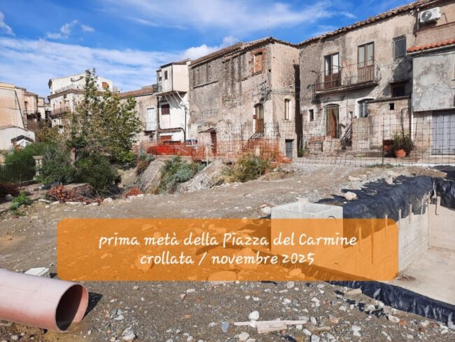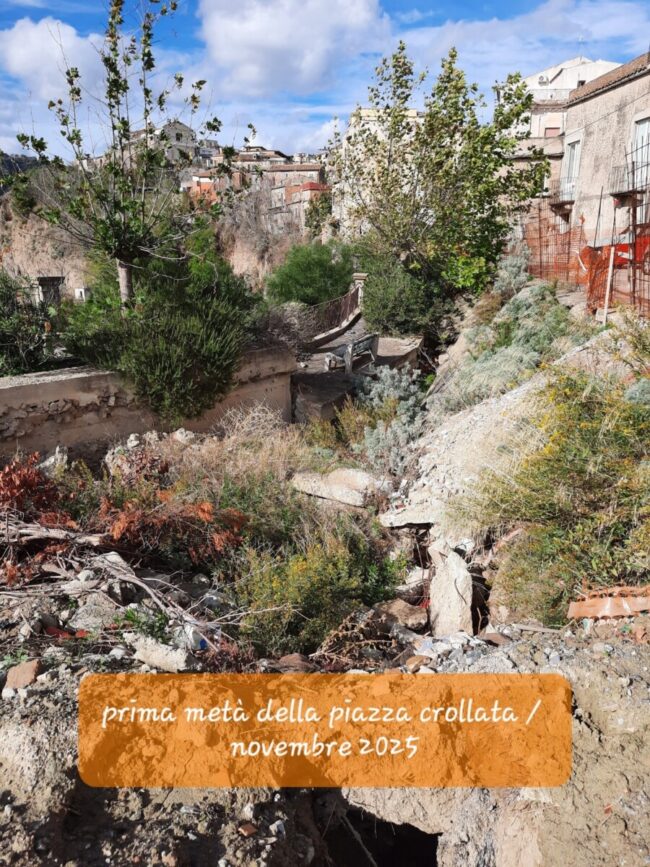 Lì sul bordo della rupe è crollata la Piazza Del Carmine, una delle più impressionante della Locride. I lavori per la sua ristrutturazione sono in ritardo da anni. Fino all’autunno di 2024 su questa rupe instabile è stata costruita una sottostruttura per ca. la metà della nuova piazza, con tonnellate di cemento armato e senza stabilizzare prima i fianchi della rupe pietrosi ed erodi. Di più i muri laterali della struttura, da noi chiamata “vasca”, per mesi erano esposti alla pioggia senza alcuna protezione. Il cantiere rimaneva fermo e in uno stato di abbandono fino alla primavera 2025. Così nell’inverno 2024 una forte frana, causata di infiltrazioni di acque meteoriche, ha distrutto il fianco della rupe e con essa ha danneggiato la struttura appena costruita e ha devastata la strada che porta alla zona Palma ai piedi della rupe. Un risultato clamoroso e uno stato pericolosissimo che dura fino ad oggi. Sul cantiere da ottobre 2024 non è visibile nessun progresso notevole. Alla fine di quest’estate le parti laterali della vasca sono stati coperti con una plastica, contro l’infiltrazione delle acque meteoriche, secondo noi per conservare lo stato di blocco. E non abbiamo parlato ancora dell’altra metà della piazza, la sua entrata principale per arrivare alle nostre case. Lì, lontano di qualsiasi intervento, il crollo si peggiora giorno per giorno drammaticamente. In allegato trovate alcune foto che dimostrano tutte le condizioni gravi. Questa situazione assolutamente disastrosa comporta che le case degli abitanti, così come i monumenti storici e di un valore inestimabile, quali la Chiesa del Carmine e l’Antico Teatro, sono fortemente a rischio di crollo e che noi che abitiamo lì siamo sempre più isolati e stiamo vivendo nella costante paura di perdere tutto ciò che rappresenta la nostra identità .