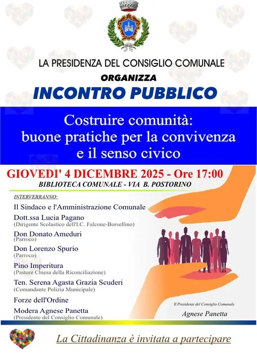 La Presidenza del Consiglio Comunale di Caulonia informa la cittadinanza che giovedì 4 dicembre, alle ore 17:00, presso la Biblioteca Comunale di via Brigida Postorino, Caulonia Marina, si terrà un incontro pubblico dal titolo: «Costruire comunità: buone pratiche per la convivenza e il senso civico».