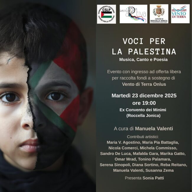 Martedì 23 dicembre 2025, ore 19.00, presso l’Ex Convento dei Minimi di San Francesco di Paola, sito in Largo Molinaro a Roccella Ionica, andrà in scena “Voci per la Palestina, musica canto e poesia”, evento di raccolta fondi a favore dell’associazione Vento di Terra Onlus.