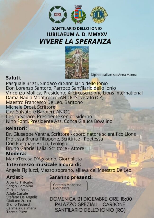 Sant’Ilario dello Ionio si prepara ad accogliere domenica 21 dicembre 2025 alle ore 18.00, nella sala consiliare di Palazzo Speziali – Carbone, “Vivere la speranza”, un significativo appuntamento culturale, spirituale per “Iubilaeum A.D. MMXXV”. L’evento, promosso dal Comune di Sant’Ilario dello Ionio, con la collaborazione di ANIOC (Associazione Nazionale Insigniti Onorificenze Cavalleresche) e Lions International, curato dalla poetessa Bruna Filippone, intende valorizzare il messaggio universale della speranza attraverso interventi culturali, testimonianze, arte e musica.