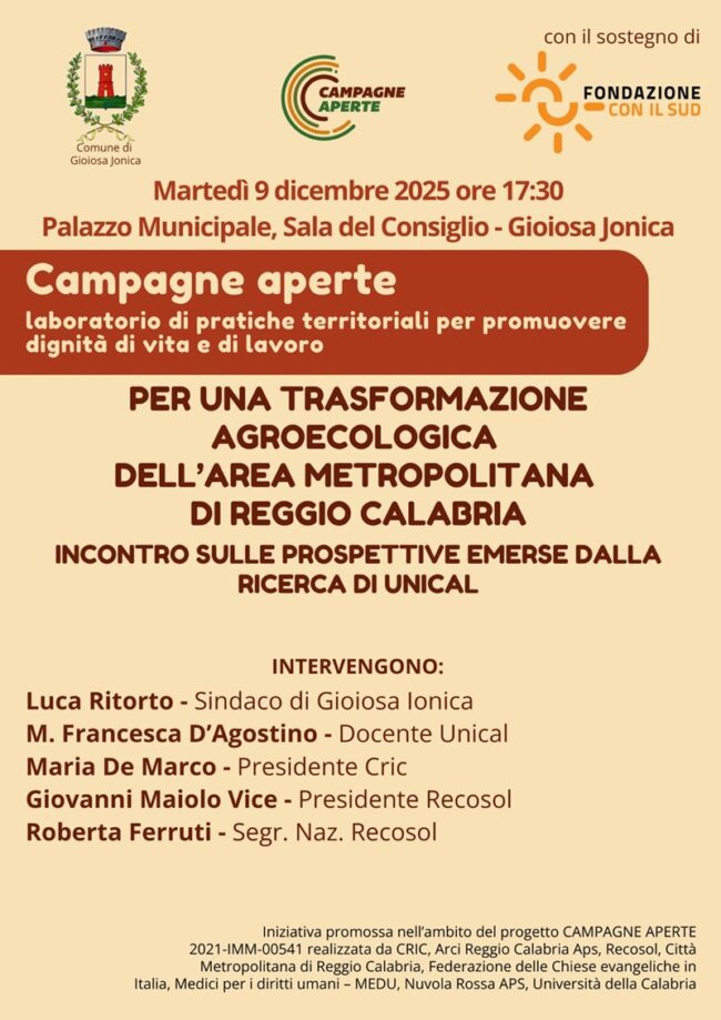 Il progetto “Campagne aperte” tornerà anche a Gioiosa Ionica con un incontro pubblico in programma martedì 9 dicembre 2025 alle 17:30, nella Sala del Consiglio del Palazzo Municipale. L’evento si concentrerà sulla trasformazione agroecologica dell’area metropolitana di Reggio Calabria, alla luce dei risultati di una ricerca dell’Università della Calabria.