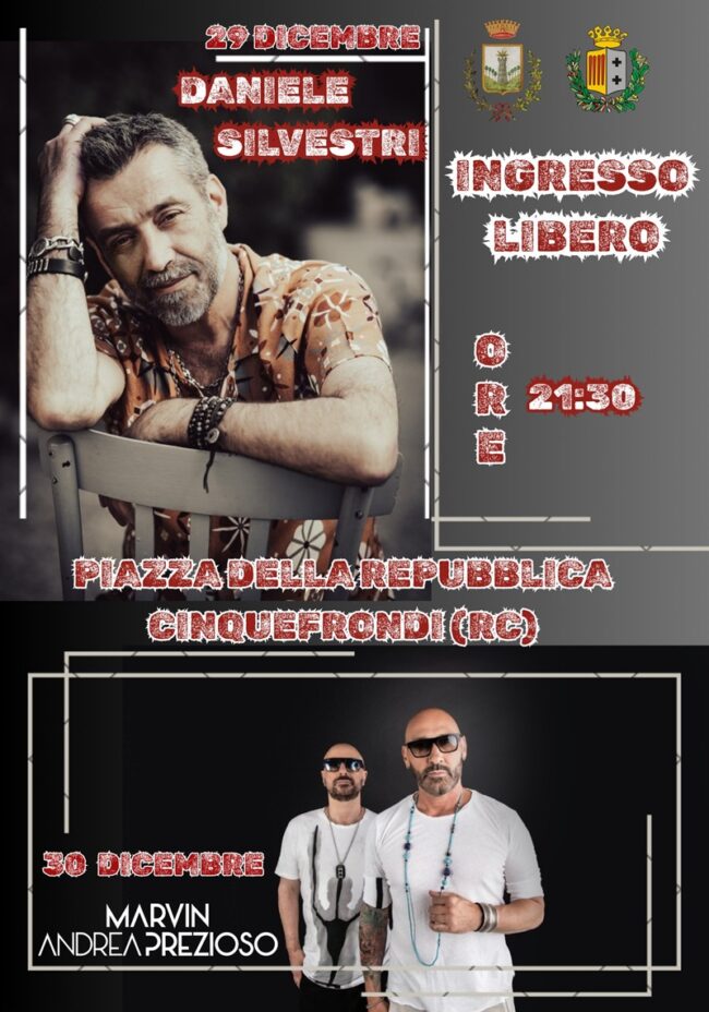 Le celebrazioni continueranno il giorno successivo con una seconda, travolgente serata-evento dedicata al ballo e al divertimento. Protagonisti assoluti saranno Marvin e Prezioso, due nomi di primissimo piano dello scenario musicale dance nazionale e internazionale, pronti a trasformare Piazza della Repubblica in una grande festa a cielo aperto, capace di coinvolgere e far ballare persone di tutte le età. Anche questa serata sarà totalmente gratuita, pensata per unire, coinvolgere e salutare la fine dell’anno nel modo più gioioso e partecipato possibile.