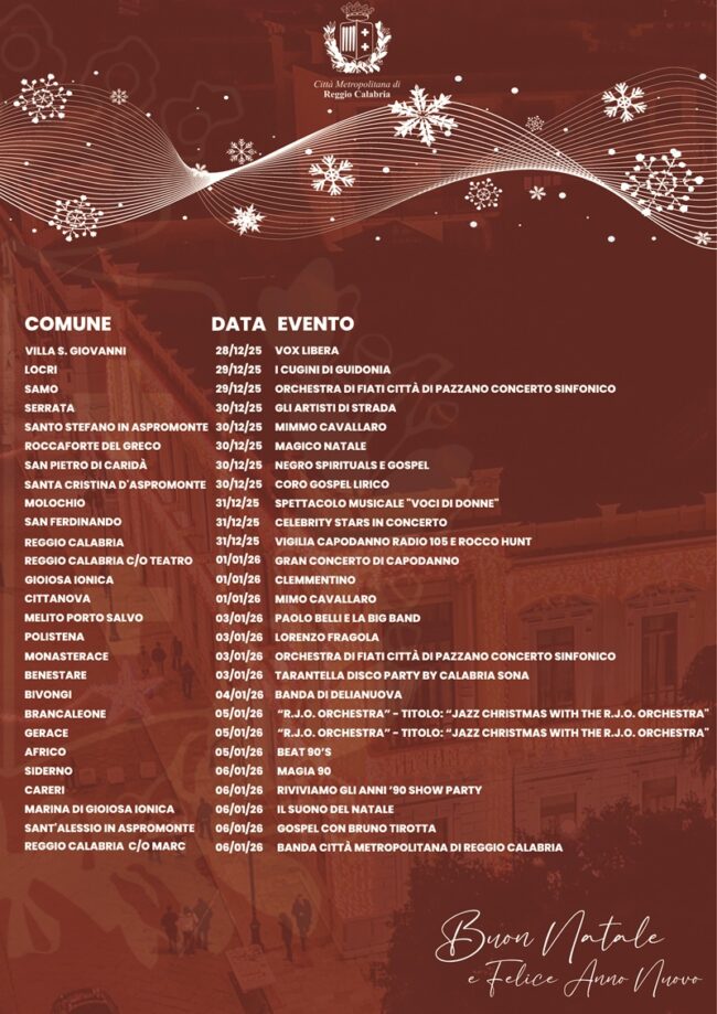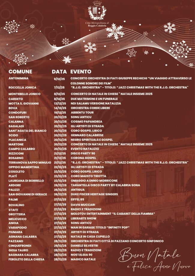 Se Antonimina, Roccella Jonica, Montebello Jonico, Cardeto, Motta San Giovanni, Bova e Condofuri hanno già pregustato il bello di una programmazione ricca e variegata, il viaggio di Natale della Città Metropolitana procede oggi a San Roberto (Sonu anticu), Calanna (Cosimo Papandrea in concerto), Bagaladi (Gli artisti di strada), Sant’Agata del Bianco (Coro Gospel Lirico), Scido (Gennaro Calabrese show), Placanica (Negro Spirituals e Gospel), Martone (Concerto di Natale in chiese “Natale Insieme 2025) e Campo Calabro (evento natalizio).