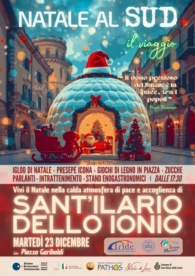 All’insegna dell’accoglienza e della condivisione, Sant’Ilario dello Ionio, martedì 23 dicembre, in Piazza Garibaldi, a partire dalle ore 17.30, ospiterà l’evento “Natale al Sud – il viaggio”, promosso dalla Cooperativa sociale Pathos e dall’amministrazione comunale, in collaborazione con Eurocoop Jungi Mundu, Cooperativa sociale Pathos e Consulta giovanile di Sant’Ilario. Un appuntamento pensato per grandi e piccoli, che richiama il messaggio più autentico di queste festività, come ricordato da Papa Francesco: “Il dono prezioso del Natale è la pace, tra i popoli”.