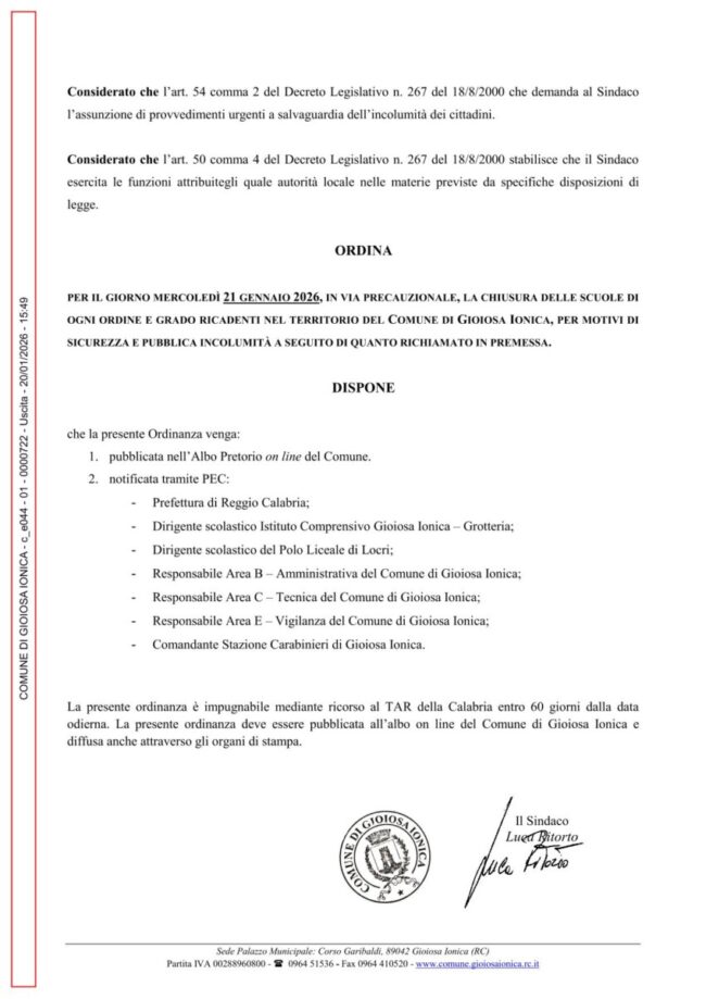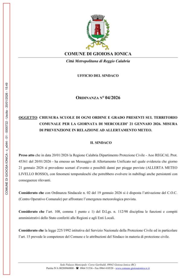 A causa delle avverse condizioni meteorologiche e dell’allerta diramata dalla Protezione Civile, domani le scuole di ogni ordine e grado resteranno chiuse a Gioiosa Ionica. Si invita la cittadinanza a seguire gli aggiornamenti ufficiali e ad adottare comportamenti prudenti.
