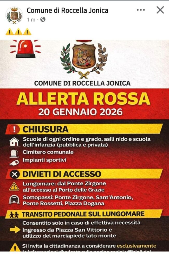 Come conseguenza dell’allerta rossa diramata dalla Protezione civile per la giornata di domani 20 gennaio 2026, il comune di Roccella Jonica ha preso dei provvedimenti a tutela dell’incolumità pubblica: