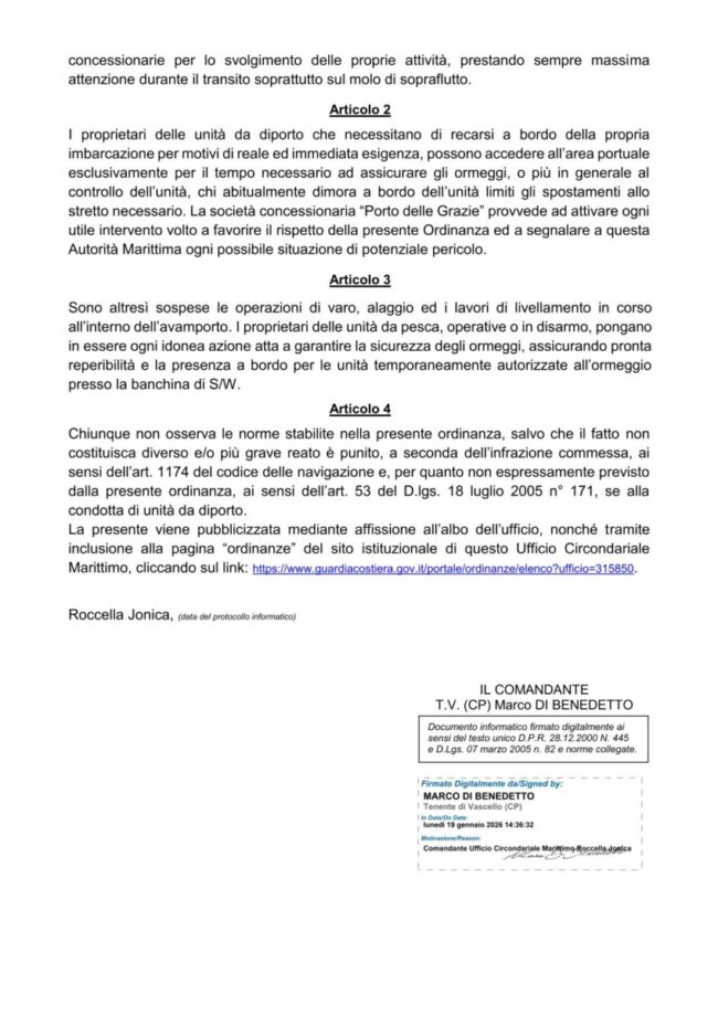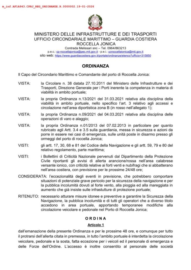 La Guardia Costiera di Roccella Jonica ha emanato un’ordinanza che vieta l’accesso all’intero ambito portuale per le prossime 48 ore, o comunque fino al termine dell’allerta meteo. È interdetta la circolazione veicolare e pedonale, così come la sosta, fatta eccezione per mezzi e personale di emergenza, Forze dell’Ordine e società concessionarie per attività operative.