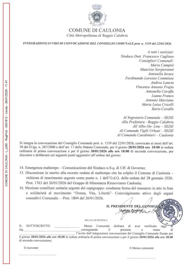 Si amplia l’ordine del giorno del consiglio comunale di Caulonia, convocato per il prossimo 28 gennaio, con l’inserimento di nuovi punti. Il consiglio sarà chiamato a discutere dei danni causati dall’ondata di maltempo che ha colpito il Comune di Caulonia.