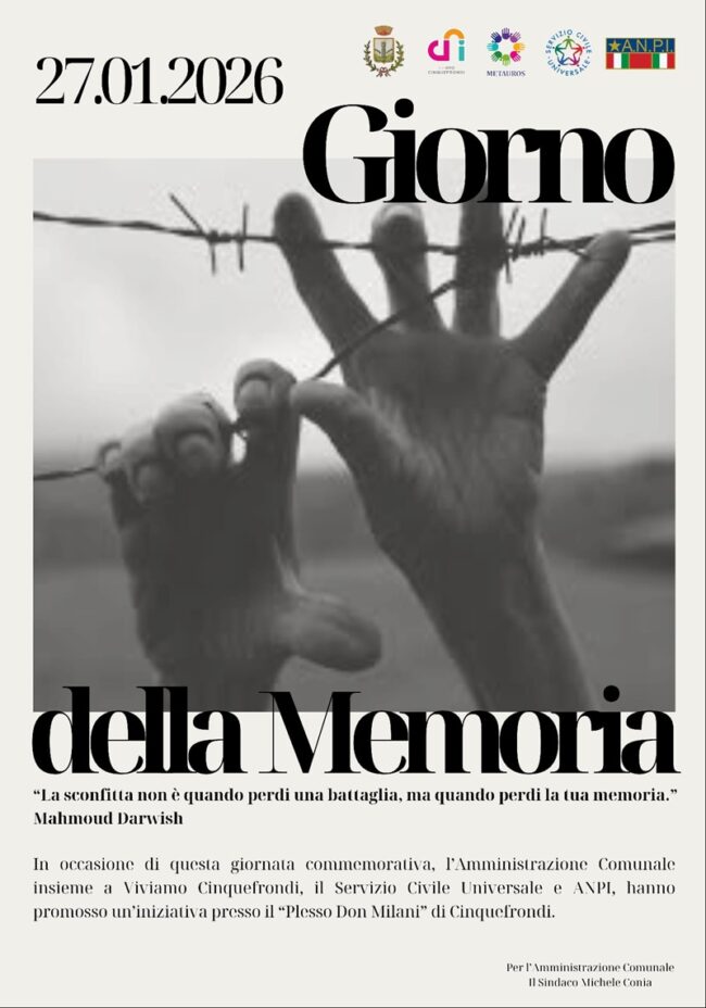 Cinquefrondi, forte di una storia e di una tradizione civica improntata alla solidarietà, alla partecipazione e alla giustizia sociale, considera il 27 gennaio non una semplice ricorrenza simbolica, ma un momento alto di riflessione collettiva e di responsabilità istituzionale. Per questo motivo, nella giornata odierna, le bandiere del Municipio sono esposte a mezz’asta, quale segno tangibile di rispetto, memoria e condivisione del dolore che ha segnato una delle pagine più buie della storia dell’umanità. Questa Amministrazione comunale, da sempre impegnata nella promozione di una cultura della pace e della legalità, ritiene fondamentale mantenere viva la memoria storica, soprattutto in un tempo in cui i valori fondanti della convivenza civile appaiono sempre più fragili. Ricordare la Shoah significa ribadire con forza il rifiuto di ogni forma di razzismo, antisemitismo, discriminazione e violenza, e riaffermare il principio secondo cui la dignità dell’essere umano non può mai essere messa in discussione. In tale prospettiva si collocano le iniziative promosse dal Comune, in collaborazione con il progetto “Viviamo Cinquefrondi”, il Servizio Civile Universale e l’ANPI, che prevedono momenti di commemorazione, confronto e approfondimento presso l’Istituto Comprensivo “Francesco della Scala” – plesso Don Milani.