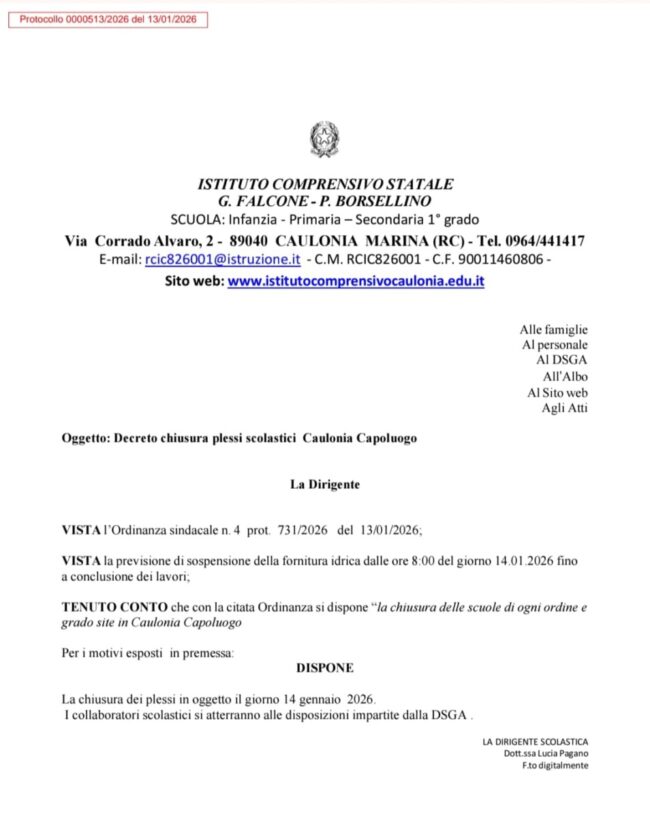 Pubblichiamo un decreto della dirigente scolastica dott.ssa. Lucia Pagano relativa all’ordinanza sindacale n. 4 prot. 731/2026 del 13/01/2026 del comune di Caulonia.
