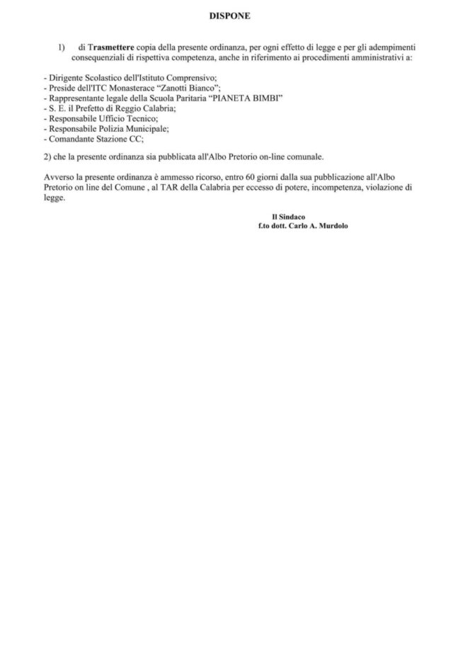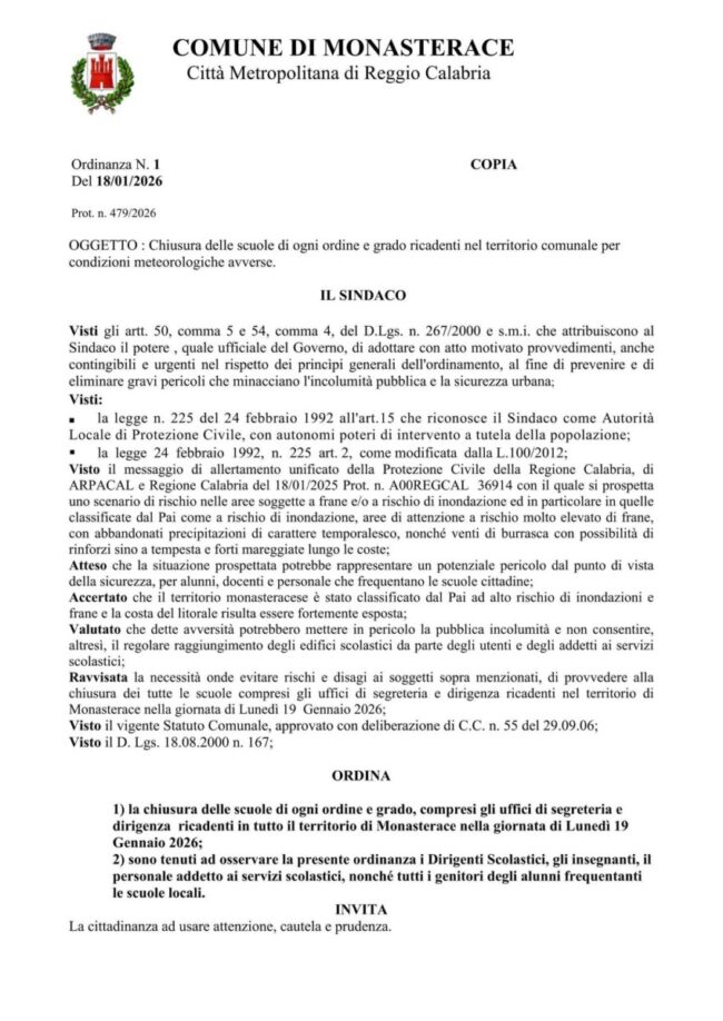 Pubblichiamo l’ordinanza del Sindaco di Monasterace che prevede la chiusura di tutte le scuole per domani a causa dell’allerta meteo che interessa il territorio:
