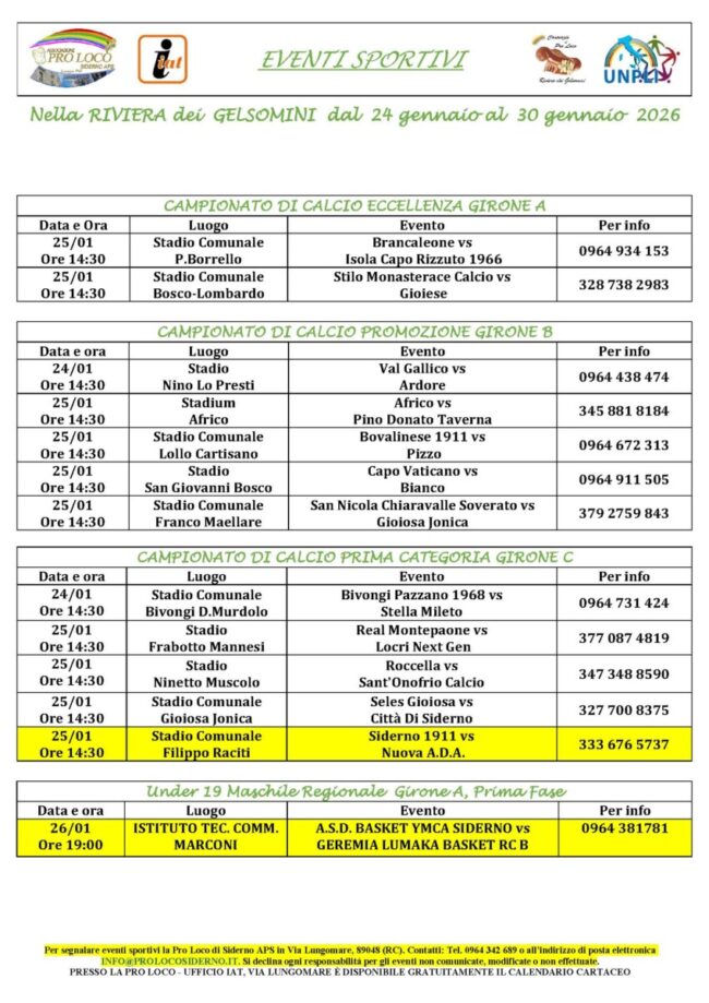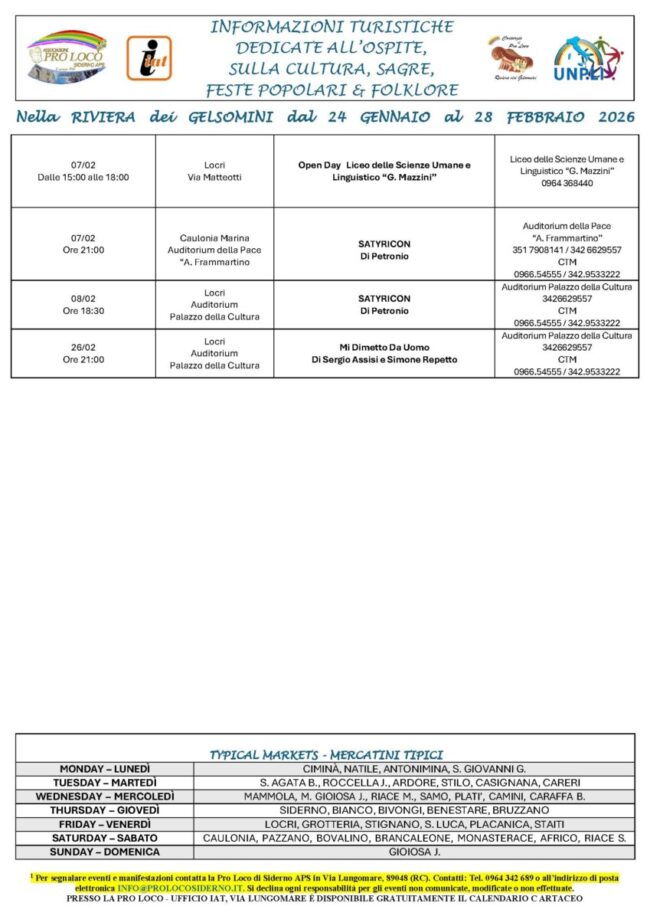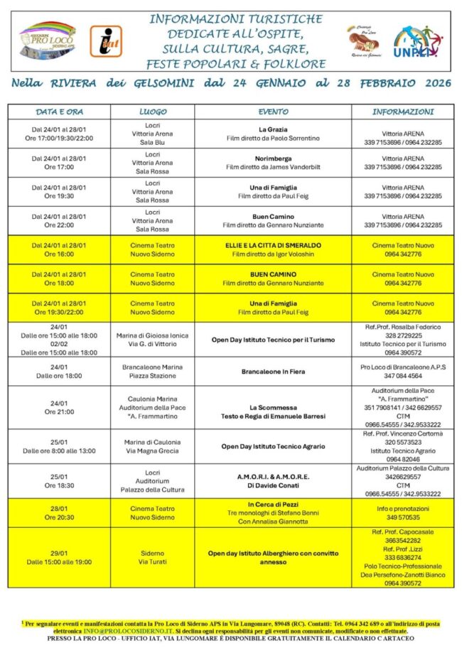 Condividiamo di seguito l’elenco degli eventi culturali e sportivi della Locride che si terranno dal 24 gennaio al 28 febbraio.