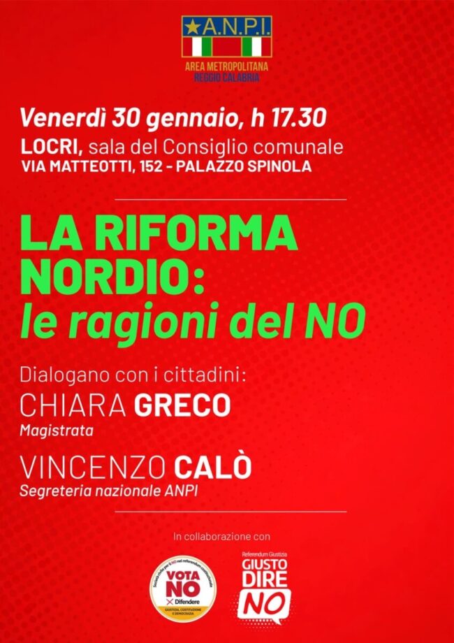 L’iniziativa si svolgerà venerdì 30 gennaio alle ore 17.30, presso la Sala del Consiglio comunale di Locri, e vedrà la partecipazione di Chiara Greco, magistrata, e Vincenzo Calò, membro della Segreteria nazionale ANPI, che guideranno l’analisi delle principali criticità della riforma, illustrando le ragioni del NO in modo chiaro e accessibile.