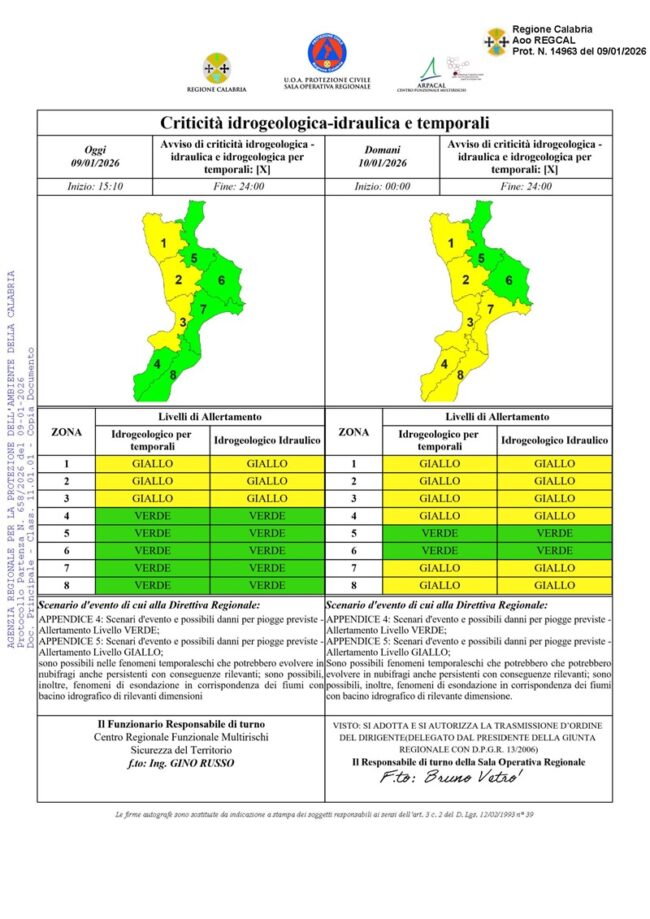 La Protezione civile regionale ha emesso un’allerta meteo gialla per rischio idrogeologico e idraulico su gran parte della Calabria, valida fino a oggi, sabato 10 gennaio.